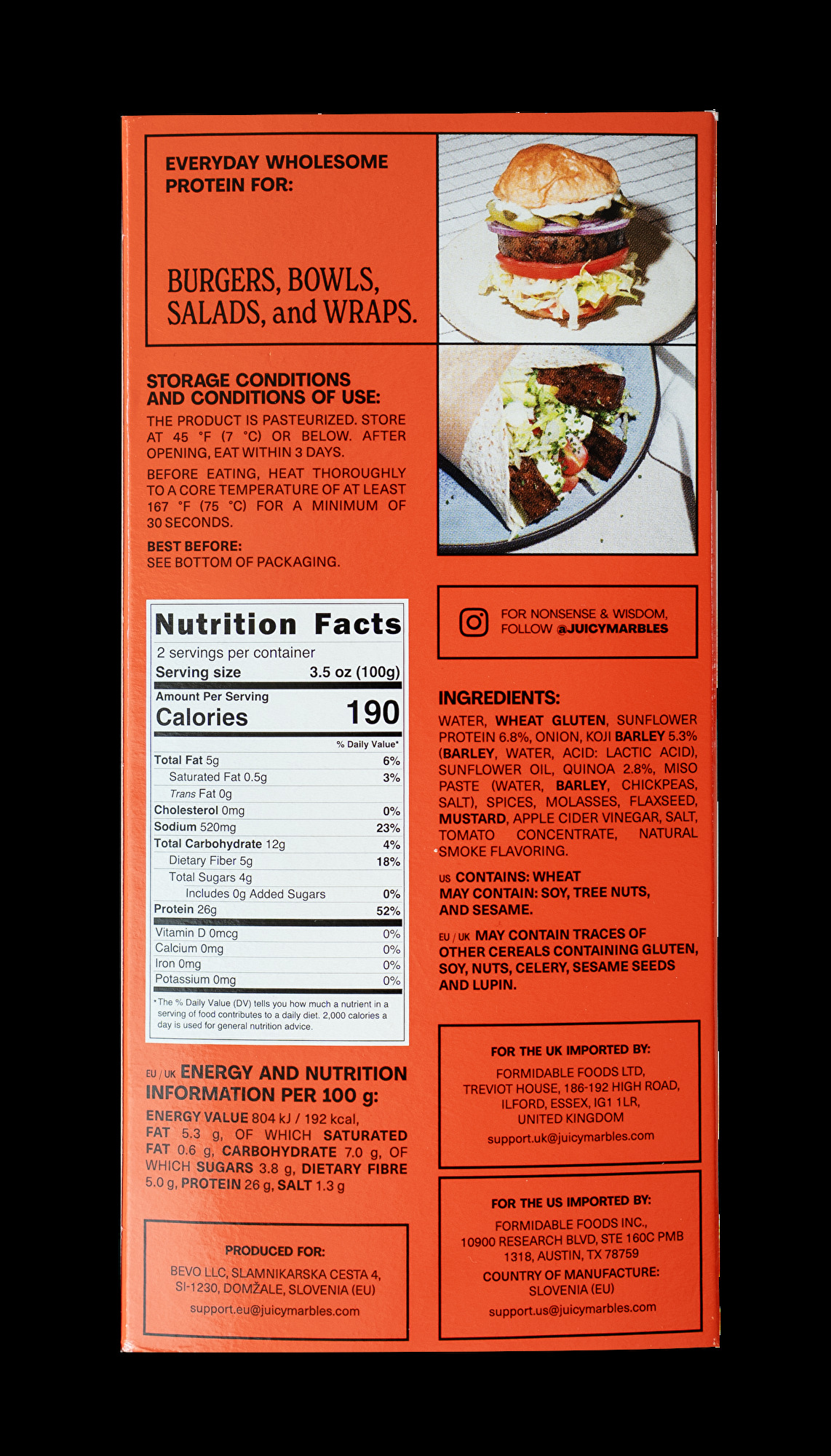 Wasser, Weizengluten, Sonnenblumenprotein 6,8 %, Zwiebeln, Koji-Gerste 5,3 %, Sonnenblumenöl, Quinoa 2,8 %, Misopaste, Gewürze, Melasse, Leinsamen, Senf, Apfelessig, jodiertes Salz, Tomatenkonzentrat, natürliches Raucharoma