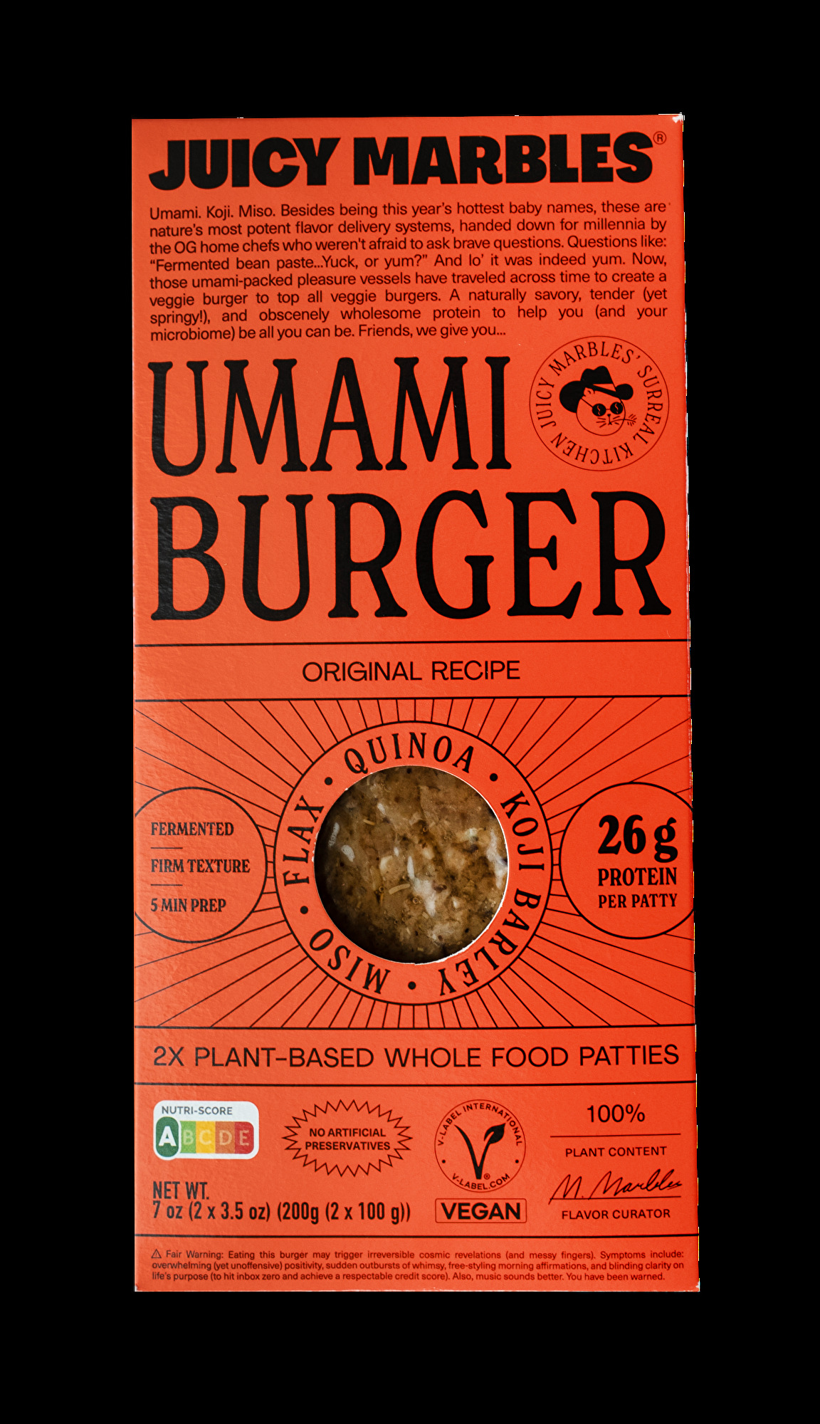 Der Umami Burger von Juicy Marbles wird Dich umhauen! Die beiden fermentierten Vollkorn-Patties haben den vollen Umami-Geschmack mitbekommen, sind saftig, nussig und schmelzen förmlich auf der Zunge.