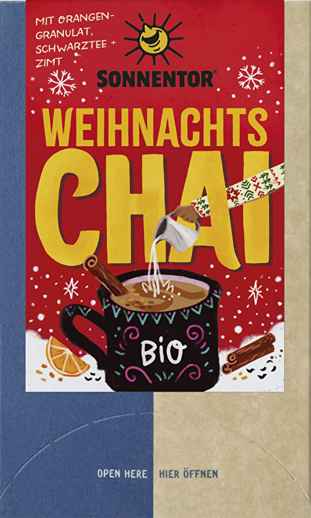 Der Weihnachts Chai von Sonnentor ist Festtagsstimmung im Teebeutel! Die 18 Beutel kommen mit einem Schwarzen Tee in Bioqualität daher, der mit Zimt, Nelken und Orangengranulat verfeinert wurde. Kurz aufbrühen und Du bist mitten in der besinnlichen Weihnachtszeit!