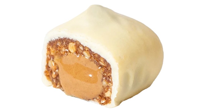 Dattelpaste, weißer kakaobutterhaltiger Überzug (15%) (Kakaobutter, Reisdrinkpulver, Kokosnusspulver, Süßungsmittel: Erythrit, Orangenpulver), Haselnuss-Füllung (15%) (Haselnuss (42%), Dattelpulver, Cashewmus, Kakaobutter), glutenfreies Hafermehl, Haselnuss (8,4%), Dattelsirup, Mandelmus, Tapiokafaser, Chai-Gewürzmischung (1,45%) (Zimt, Ingwerpulver, Kardamom, Muskatnuss, Nelkenpulver, Korianderpulver, Piment), Kakaobutter, Meersalz, Vanilleextrakt.