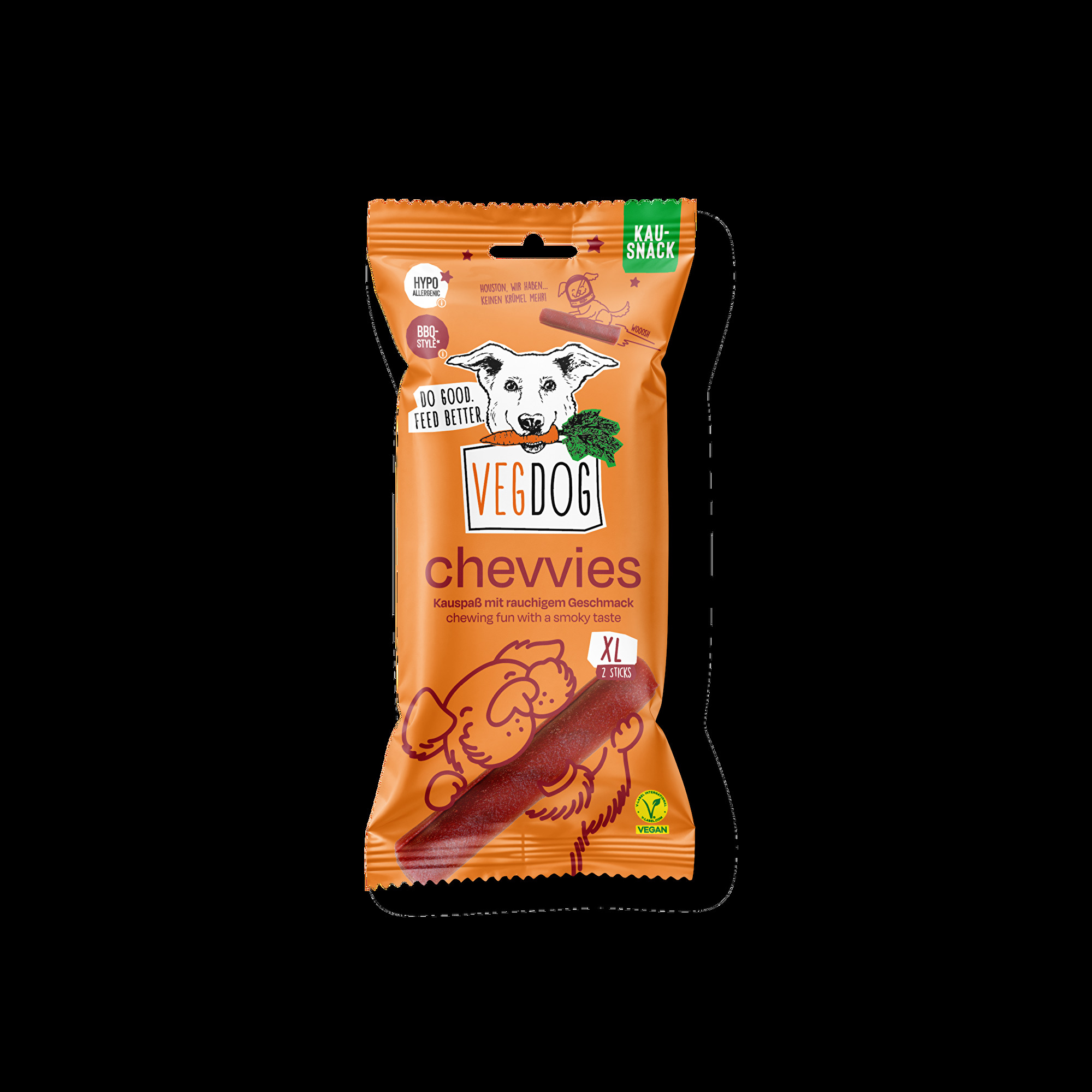 Die Chevvies XL von Vegdog: Zwei herzhafte, große Kauknochen mit BBQ-Geschmack und wenig Fett. Der hypoallergene Snack eignet sich gerade für Hunde mit empfindlicher Verdauung. Die Knochen sind nicht zu hart und herzhaft-rauchig im Geschmack.