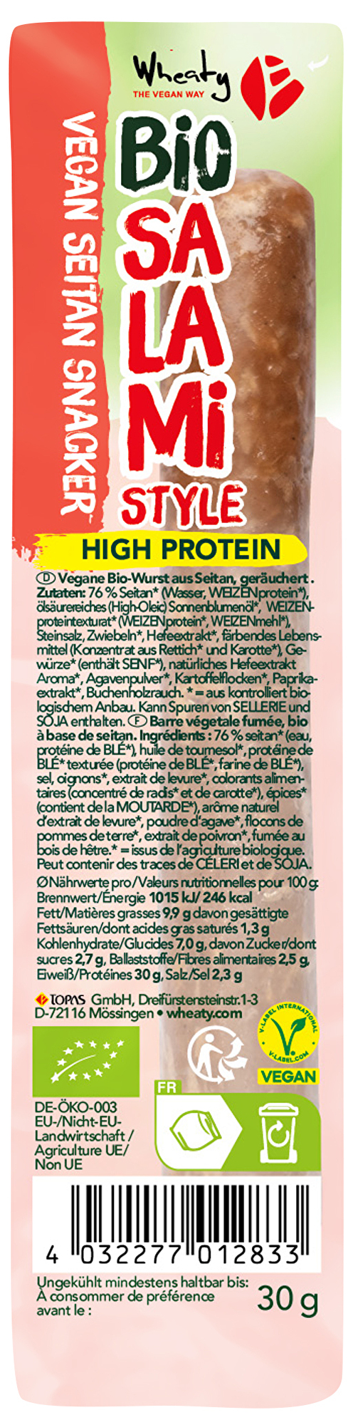 Salami Style Snacker von Wheaty – Würzig-intensiv im Geschmack und dabei rein pflanzlich! Diese herzhafte Snackalternative erinnert an klassische Salami, ist ungekühlt haltbar und liefert wertvolles Protein. Perfekt für unterwegs, als kleiner Hungerstiller oder energiereicher Begleiter für jede Herausforderung.